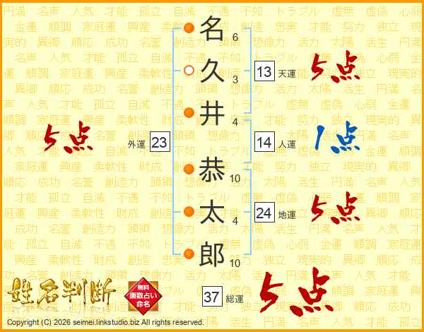 名(6画)久(3画)井(4画) 恭(10画)太(4画)郎(10画)