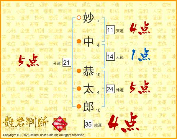 妙(7画)中(4画) 恭(10画)太(4画)郎(10画)