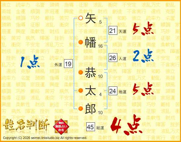 矢幡恭太郎さんの総運は45画の4点!