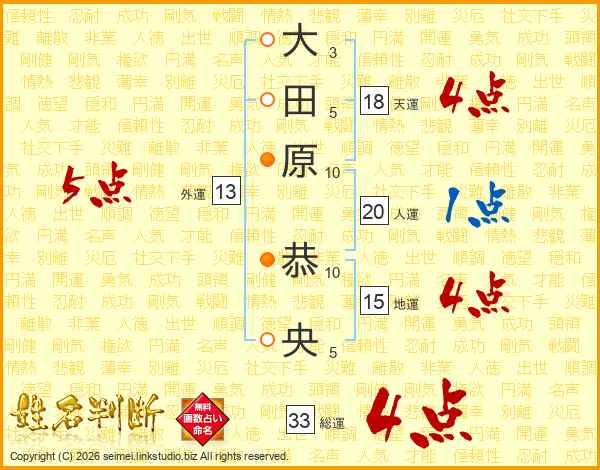 大(3画)田(5画)原(10画) 恭(10画)央(5画)