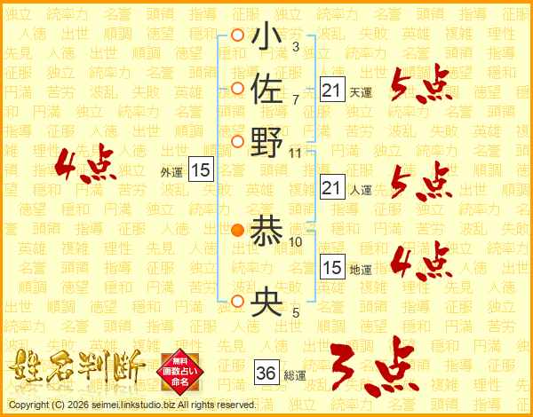 小(3画)佐(7画)野(11画) 恭(10画)央(5画)