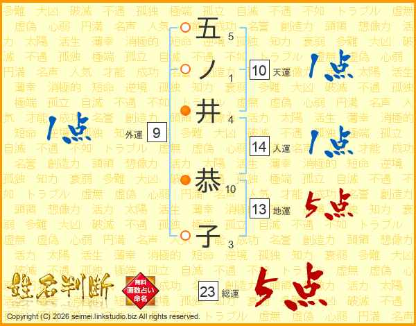 五(5画)ノ(1画)井(4画) 恭(10画)子(3画)