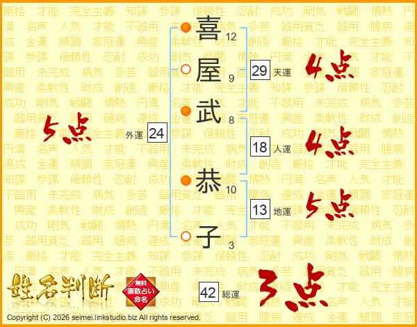 喜(12画)屋(9画)武(8画) 恭(10画)子(3画)