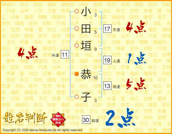小(3画)田(5画)垣(9画) 恭(10画)子(3画)