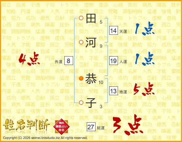 田(5画)河(9画) 恭(10画)子(3画)