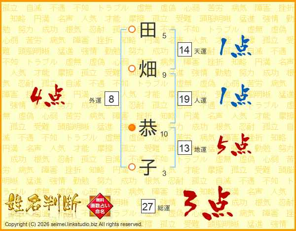 生活面を象徴する運勢です。外部から受ける影響力を表し、結婚運、家庭運や職場、環境への順応性を表します。総運から人運を引いた画数。姓や名が1文字の場合を除く。
