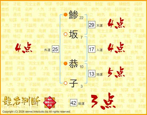 鯵(22画)坂(7画) 恭(10画)子(3画)