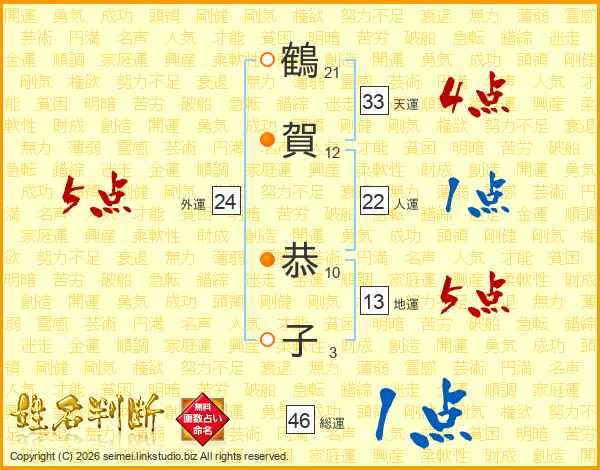 鶴(21画)賀(12画) 恭(10画)子(3画)
