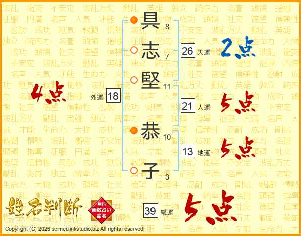 具(8画)志(7画)堅(11画) 恭(10画)子(3画)