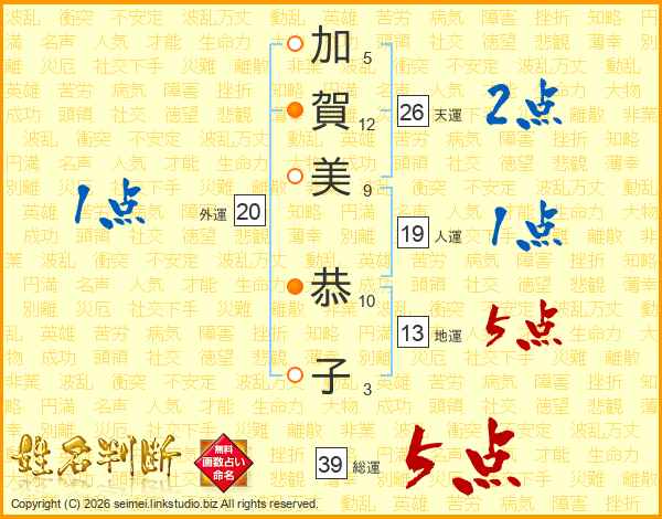 加(5画)賀(12画)美(9画) 恭(10画)子(3画)