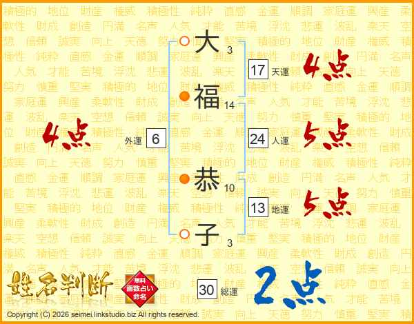 生活面を象徴する運勢です。外部から受ける影響力を表し、結婚運、家庭運や職場、環境への順応性を表します。総運から人運を引いた画数。姓や名が1文字の場合を除く。