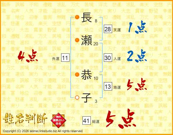 長(8画)瀬(20画) 恭(10画)子(3画)