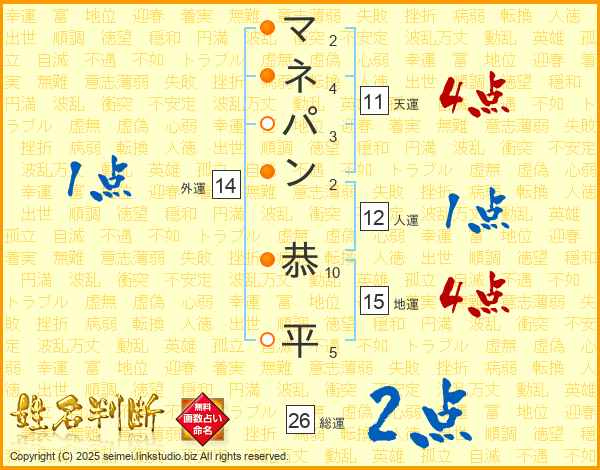 マ(2画)ネ(4画)パ(3画)ン(2画) 恭(10画)平(5画)