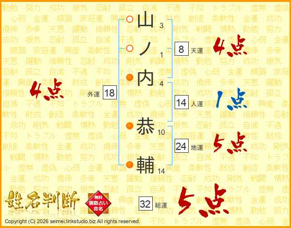 山(3画)ノ(1画)内(4画) 恭(10画)輔(14画)