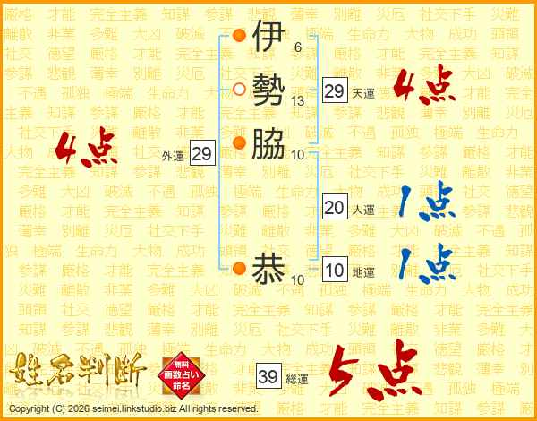 伊(6画)勢(13画)脇(10画) 恭(10画)