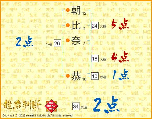 朝(12画)比(4画)奈(8画) 恭(10画)
