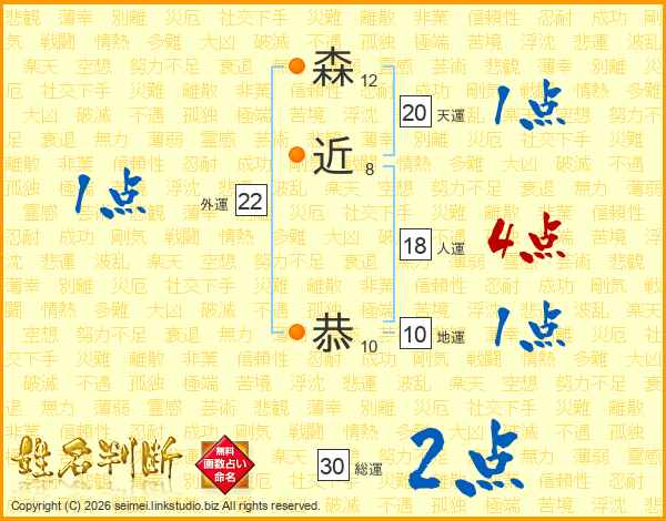 生活面を象徴する運勢です。外部から受ける影響力を表し、結婚運、家庭運や職場、環境への順応性を表します。総運から人運を引いた画数。姓や名が1文字の場合を除く。