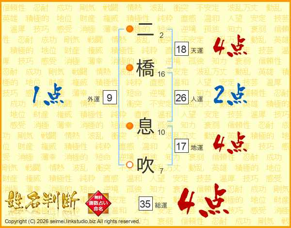 生活面を象徴する運勢です。外部から受ける影響力を表し、結婚運、家庭運や職場、環境への順応性を表します。総運から人運を引いた画数。姓や名が1文字の場合を除く。
