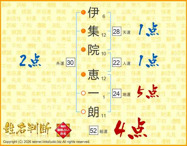 伊(6画)集(12画)院(10画) 恵(12画)一(1画)朗(11画)