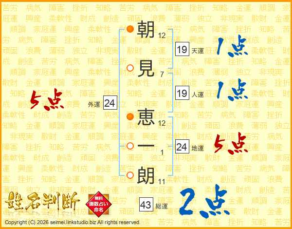 朝(12画)見(7画) 恵(12画)一(1画)朗(11画)