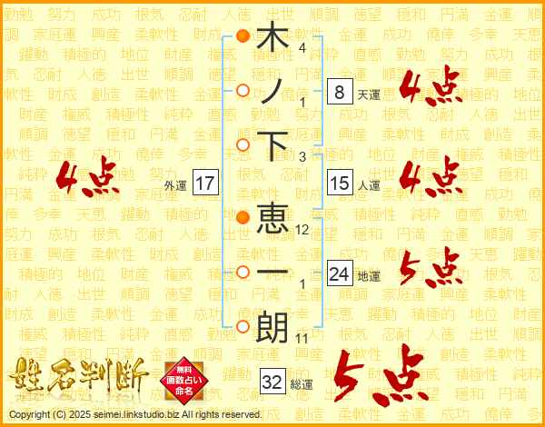 木(4画)ノ(1画)下(3画) 恵(12画)一(1画)朗(11画)