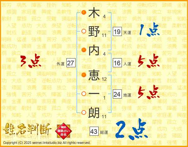 木野内恵一朗さんの総運は43画の2点!