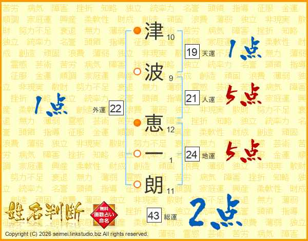 津(10画)波(9画) 恵(12画)一(1画)朗(11画)