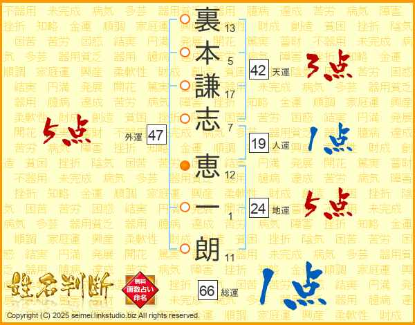 裏(13画)本(5画)謙(17画)志(7画) 恵(12画)一(1画)朗(11画)