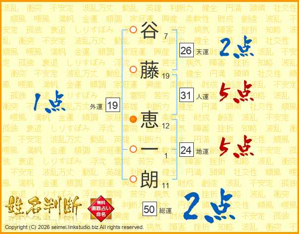 谷(7画)藤(19画) 恵(12画)一(1画)朗(11画)
