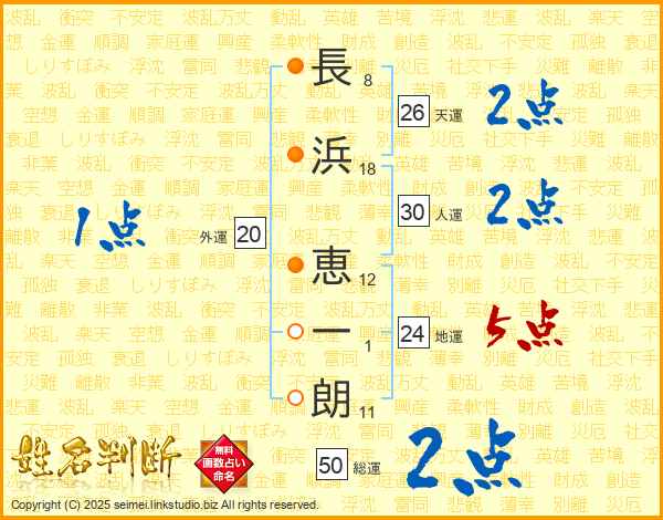 長(8画)浜(18画) 恵(12画)一(1画)朗(11画)