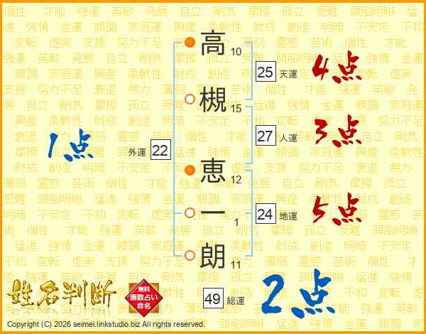 高(10画)槻(15画) 恵(12画)一(1画)朗(11画)