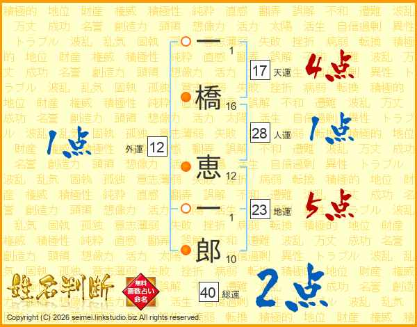 一(1画)橋(16画) 恵(12画)一(1画)郎(10画)