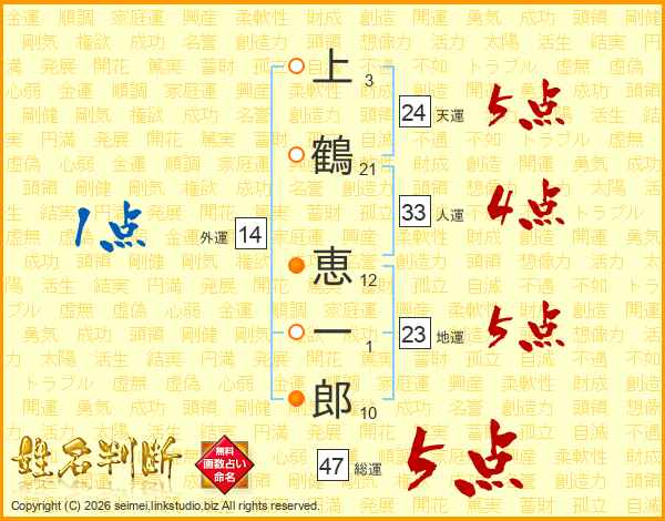 上(3画)鶴(21画) 恵(12画)一(1画)郎(10画)