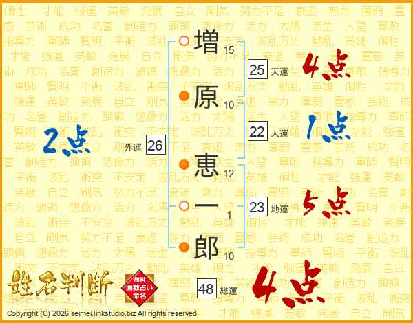 増(15画)原(10画) 恵(12画)一(1画)郎(10画)
