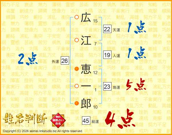 広(15画)江(7画) 恵(12画)一(1画)郎(10画)