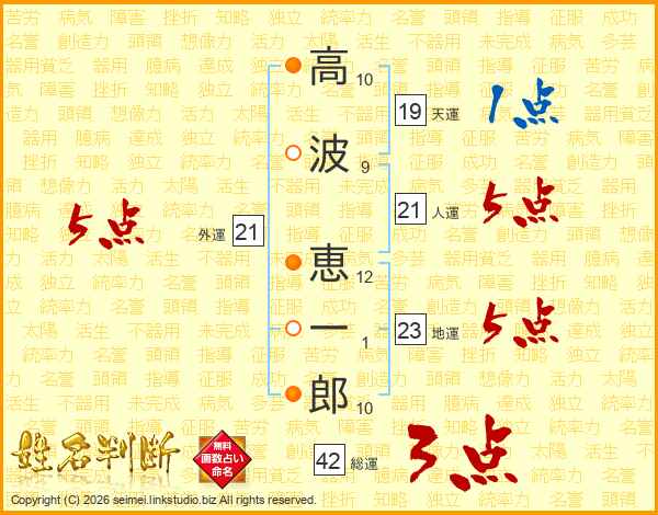 高(10画)波(9画) 恵(12画)一(1画)郎(10画)
