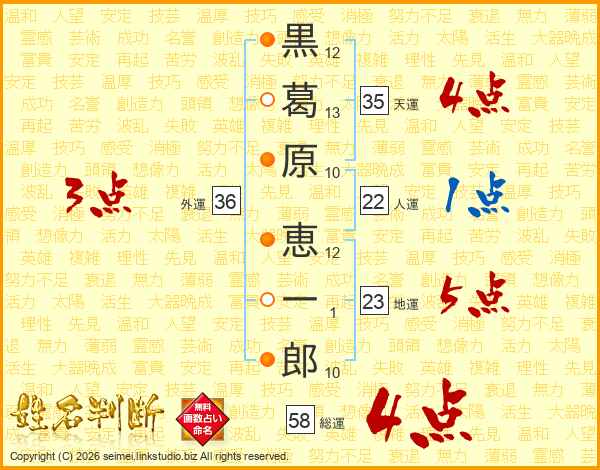 黒(12画)葛(13画)原(10画) 恵(12画)一(1画)郎(10画)