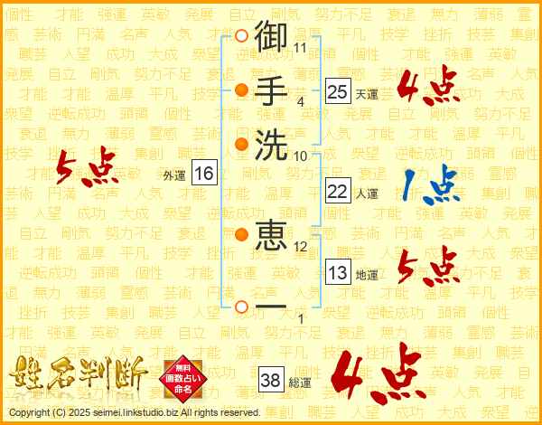 御(11画)手(4画)洗(10画) 恵(12画)一(1画)
