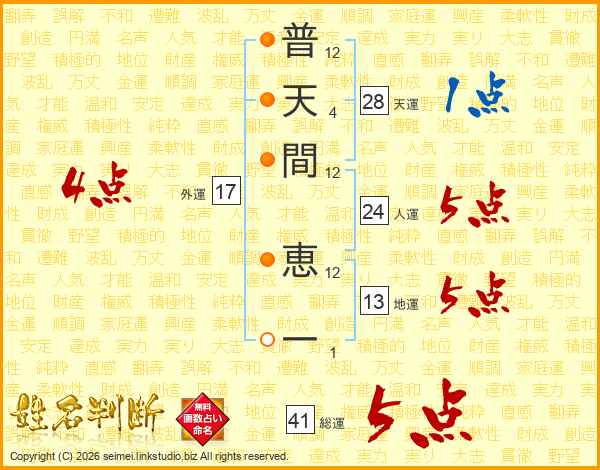 普(12画)天(4画)間(12画) 恵(12画)一(1画)
