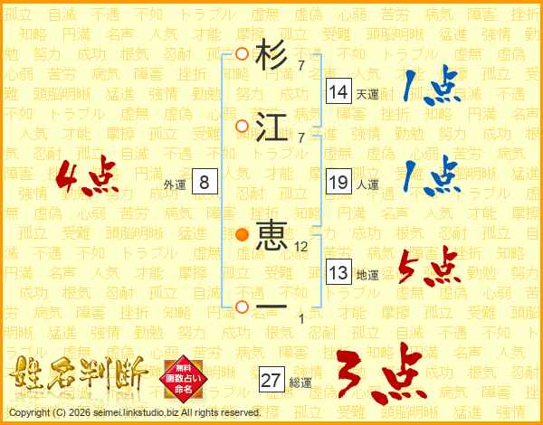杉(7画)江(7画) 恵(12画)一(1画)