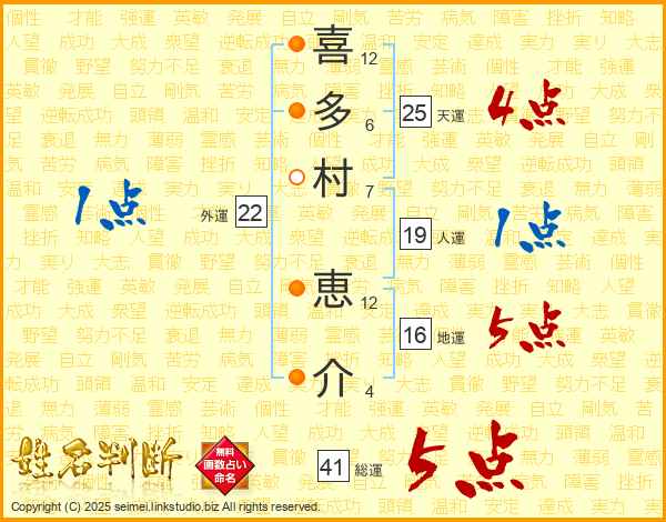 喜(12画)多(6画)村(7画) 恵(12画)介(4画)