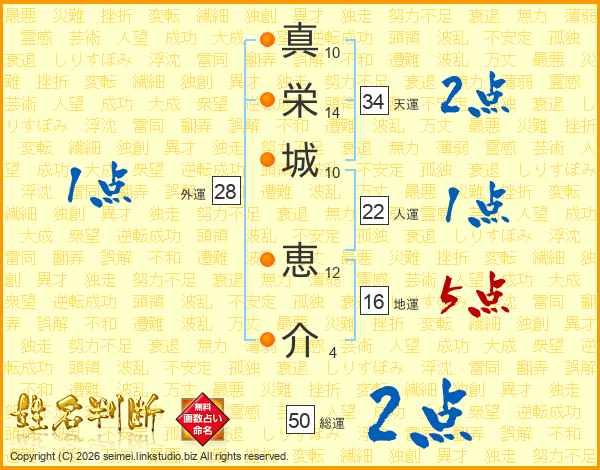 真(10画)栄(14画)城(10画) 恵(12画)介(4画)