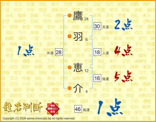 鷹(24画)羽(6画) 恵(12画)介(4画)