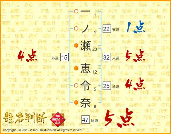 一(1画)ノ(1画)瀬(20画) 恵(12画)令(5画)奈(8画)