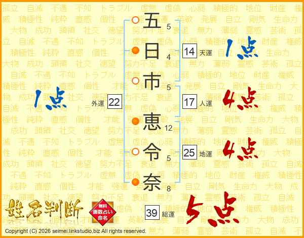 五(5画)日(4画)市(5画) 恵(12画)令(5画)奈(8画)