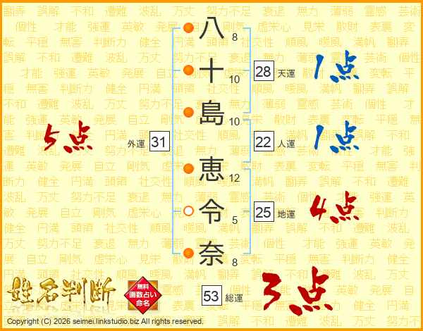 八(8画)十(10画)島(10画) 恵(12画)令(5画)奈(8画)
