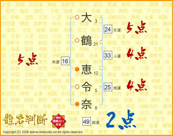 大(3画)鶴(21画) 恵(12画)令(5画)奈(8画)