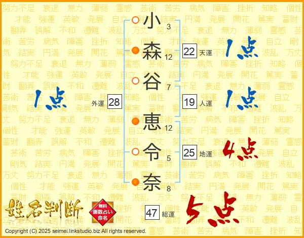 小(3画)森(12画)谷(7画) 恵(12画)令(5画)奈(8画)