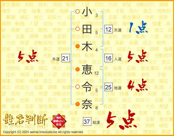 小(3画)田(5画)木(4画) 恵(12画)令(5画)奈(8画)