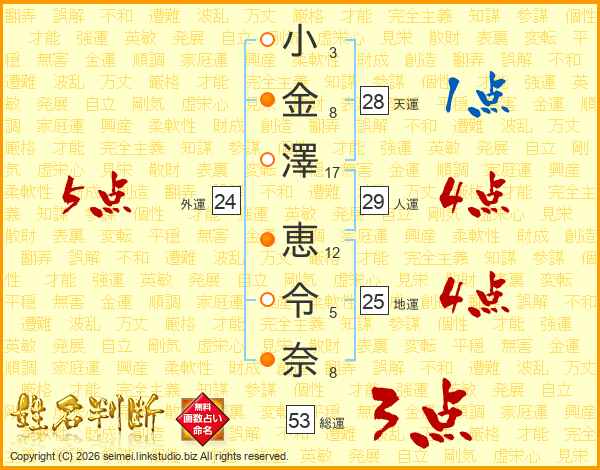 小(3画)金(8画)澤(17画) 恵(12画)令(5画)奈(8画)